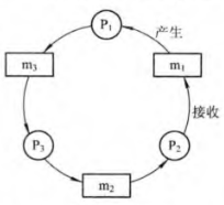当三个进程按照一个圈的形状互相发送消息,如果先都进行receive的等待,就会产生死锁,如果用资源分配图也会新城一个环。