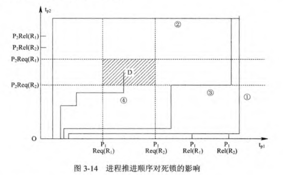 当有两个进程和两个共享资源时,推进方式有多种可能,但如果进入了阴影区域,就是不安全区,就会产生死锁,但实际上我感觉就是上面的两个的总结。