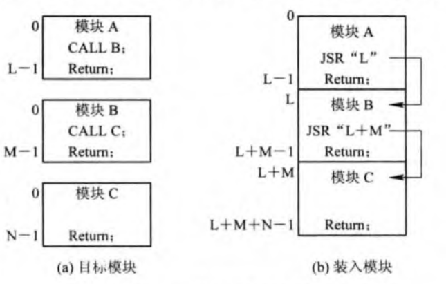 每一个目标模块都是从0开始的起始地址。而在变成装入模块的时候就将它们进行装配并不再拆开。此时要一方面将其中对于外部目标模块的调用更改为对应的装配完成后的地址,并且将每个目标模块中的相对地址更改为在装入模块中的相对地址。
