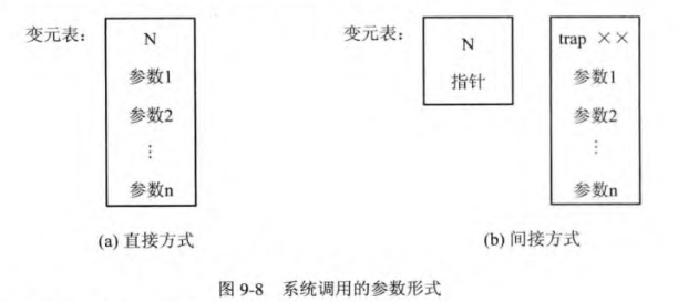 调用参数传入:系统调用命令可以顺便携带少量参数;送至有限的寄存器;或者主流的方法是放在一张表中,而寄存器中只存储指向这张表的指针。这张表也有两种方式,一种是直接,将个数和参数放在一起,另一种是间接,第一张表只放个数和指向真正的表的指针。UNIX和LINUX都使用这种方法。