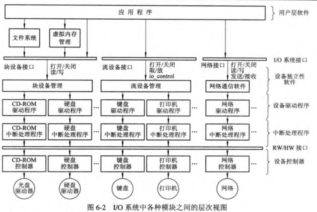 - 设备驱动程序:进程与设备控制器之间的通信程序,将抽象IO请求转换为对IO的具体命令。