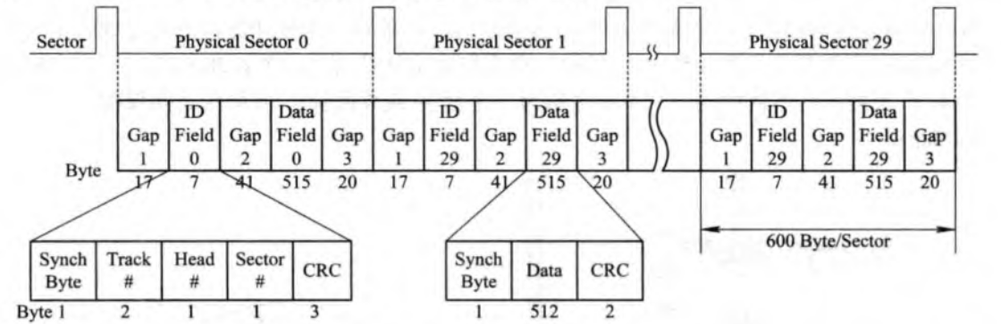 一个磁盘设备包括一个或多个物理盘片,每个磁盘片分为一个或两个存储面,每个盘面上有若干个磁道,磁道之间有间隙,为了处理方便,每条磁道存储相同数目数据,显然内层数据密度更高。每条磁道有被分为若干个扇区,扇区之间有间隙。