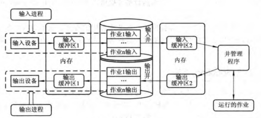 实际上就是模拟以前的脱机系统,首先所有的进程在请求这个设备的时候并没有真正的占用这个设备,而只是通过井管理程序将输入输出任务放在了输入井和输出井这两个缓冲区中,而真正的执行则是由输入输出程序独占IO设备,一个一个对井中的任务执行。